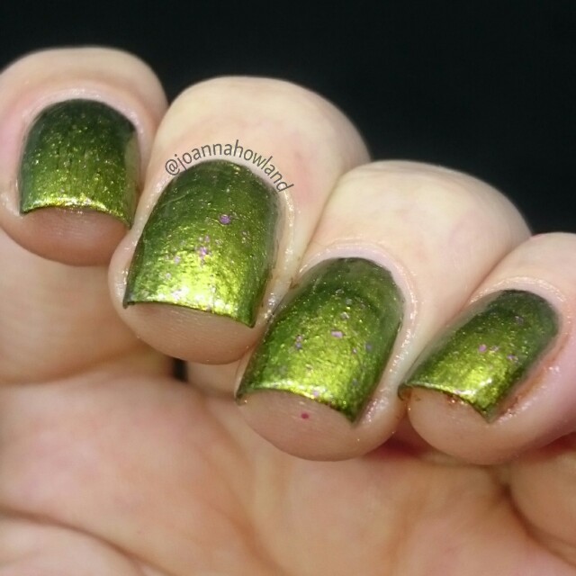 its a stunning green to gold multi chrome with pink/gold flakes in it,